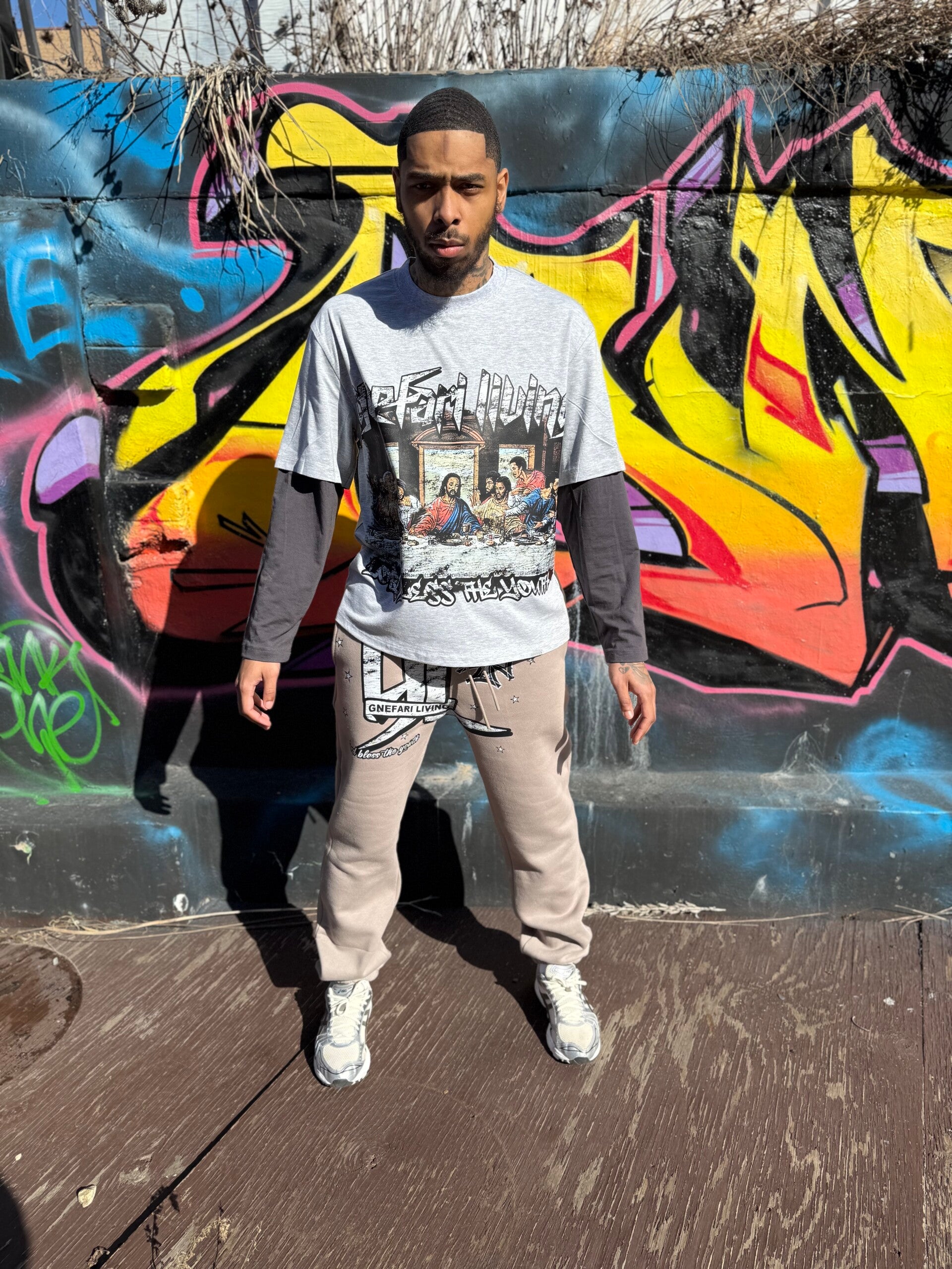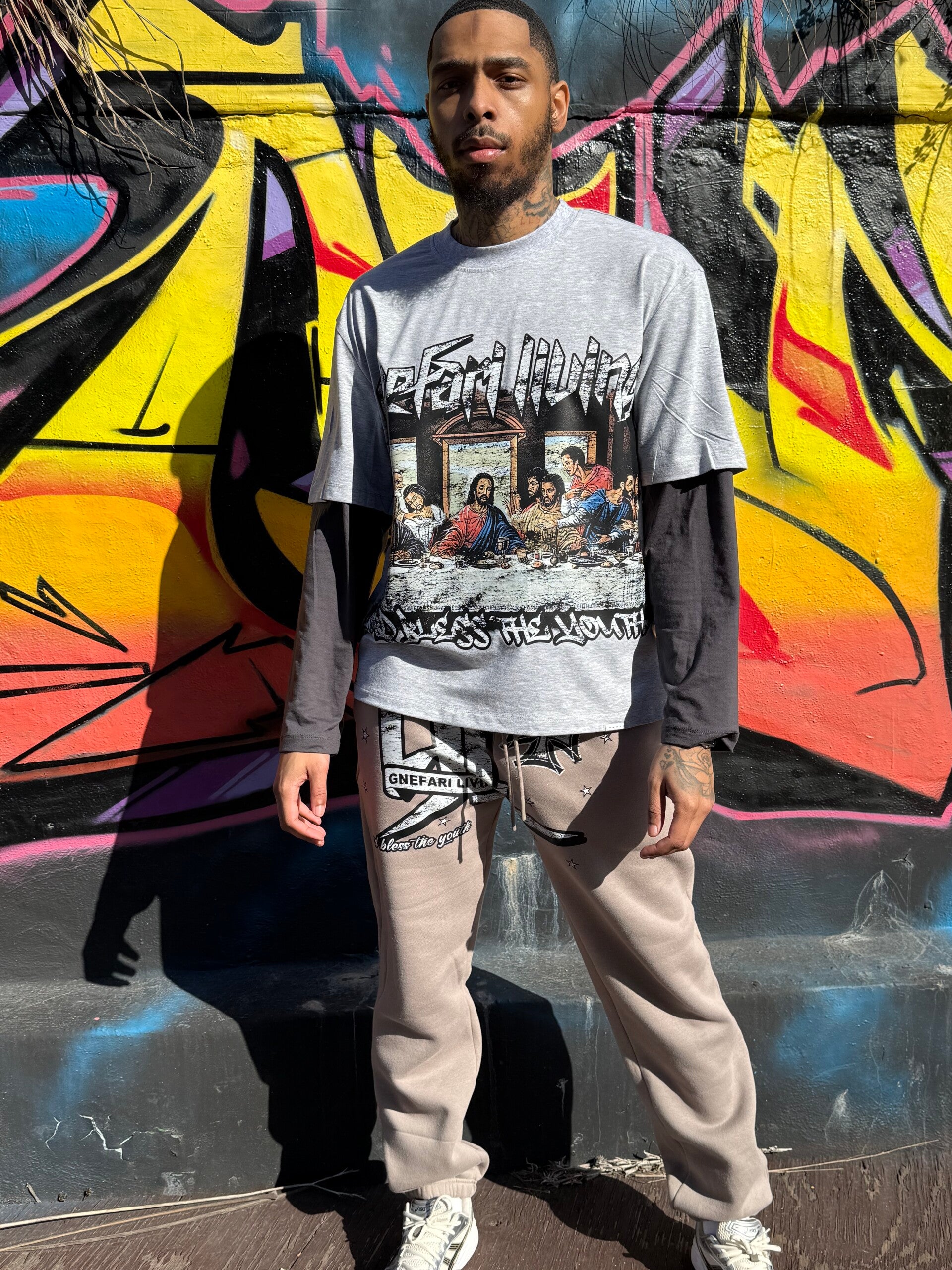 Light Gray On Dark Gray Double Long Sleeve Shirt with Dark Gray Sweats Set with Gnefari Living Print. 100% Cotton